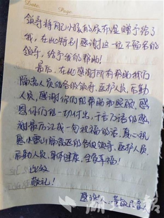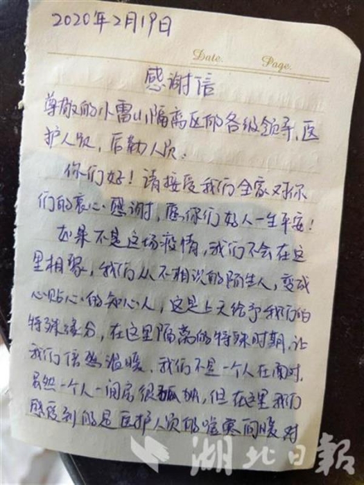 “上苍对我真好,让我认识了这样暖心的小仙女!你们的辛苦值得我们感恩和铭记……”2月19日,湖北省大冶市陈贵镇集中隔离点收到了来自密切接触者的一封感谢信。这封手写的感谢信,让奋战在一线的“战士们”倍受鼓舞,干劲十足。