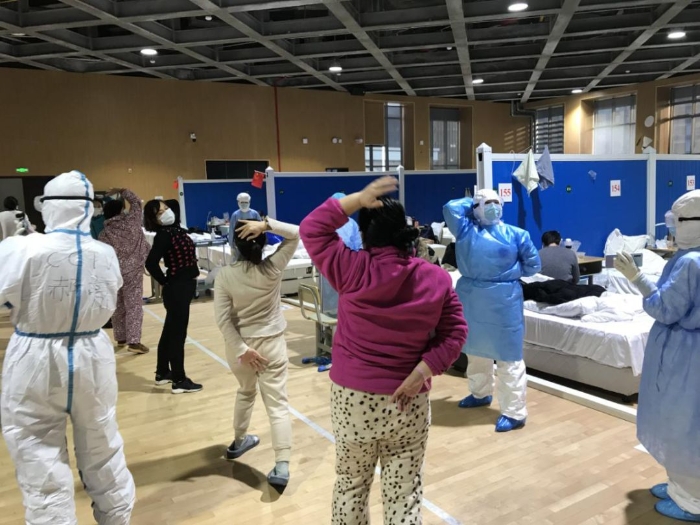 “自然呼吸,两掌从胸前向体侧平开,手心朝上,成双臂一字状。两足后跟翘起,脚尖着地,两目瞪睛平视……”2月13日,武汉,洪山体育馆,在欧阳萍的示范带领下,100多个病人集体学习练习易筋经。一套动作完成下来,大家纷纷鼓掌叫好。练完易筋经,他们有的又自发唱起了歌,《歌唱祖国》的洪亮歌声在体育馆上空回响,气氛十分热烈。