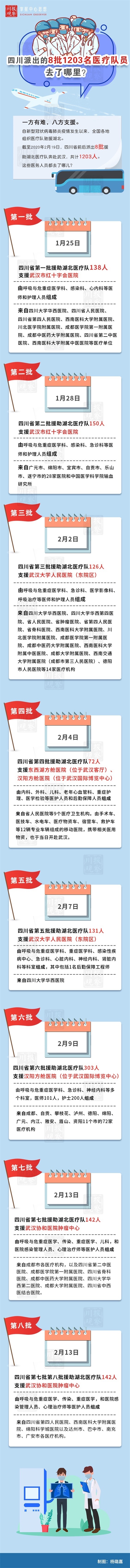 支援湖北、支援武汉,新型冠状病毒肺炎疫情发生后,四川已先后向疫区选派8支医疗队,共计1203名医护人员奋战在武汉疫情防控阻击战的第一线。