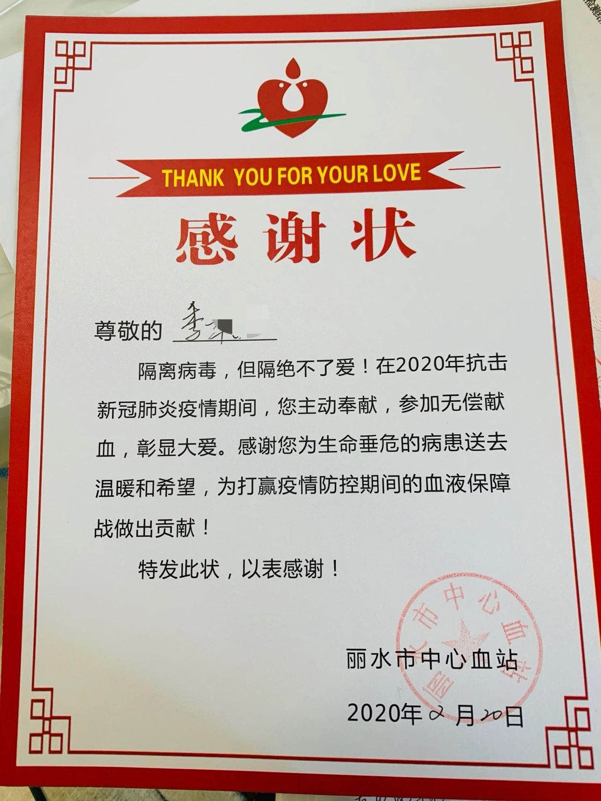 丽水市中心血站副站长纪勇平告诉记者:“非常感谢季女士捐献抗‘疫’血浆,这是我市第1位,也是浙江第9位捐献血浆的新冠肺炎康复者。”