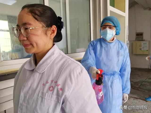 2月16日中午12点,黄石“小汤山”——黄石市中医医院(市传染病)4号楼隔离病区,护士余小银结束上午的工作,走出隔离病区。这一组照片,是同事在她不经意间帮她拍下来的。当她看到自己这番模样的时候,先是“怎么这么难看”的一番惊叹。但是,很快,她喜笑颜开。