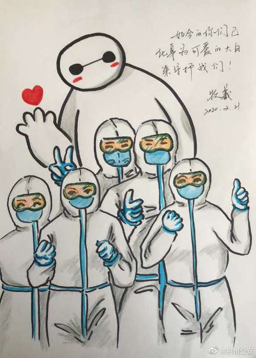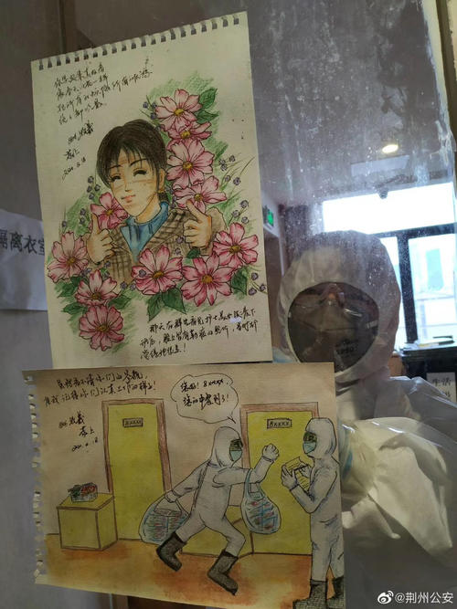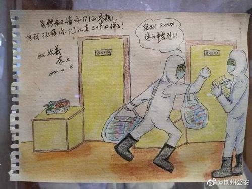 2月18日晚22时,在沙市区某集中医学隔离观察点,正在驻守执勤的沙市区公安分局崇文街派出所教导员谭成贵收到一名被隔离观察小女生的手绘画。白纸上描绘的是民警穿着防护服为她送午餐的情景,并配文:“虽然看不清你的容貌,但我记得你们认真工作的样子。”