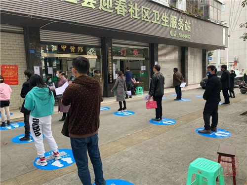 “我们想到银行、高铁站这些地方的‘黄线地标’很奏效”,夹江县卫生健康局局长雷智慧说,这些公共场合在办理者和群众之间会设置一条“黄线”来控制距离,标示‘请在一米线外等候’,大家都能自觉按照要求去做,是一种文明习惯。卫健局的工作人员因此提议,也用地标来标注大家排队的位置,“这样大家更容易接受,也不会有人‘加塞’。”