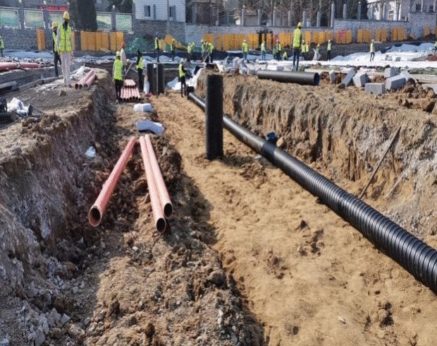 2月9日,一区室外管网混凝土浇筑完成;二区室外管网回填完成60%;三区医护通道混凝土完成,室外管网管线铺设及回填完成。