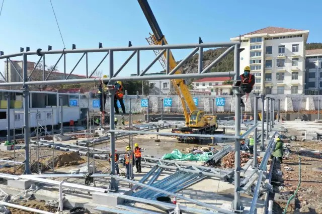 2月18日,围墙砌筑完成60%,集装箱室内隔板安装完成20%,三区CT室及ICU病房钢结构安装完成59%。