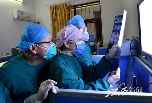 曾都医院感染一病区的江西医疗组组长赖红琳(中)与队友们在诊断患者病情。