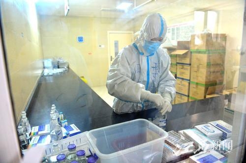 江西医疗队队员傅银娣在给患者配药。