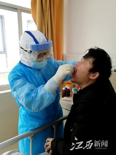 江西医疗队队员叶仁江在采集患者咽拭子。