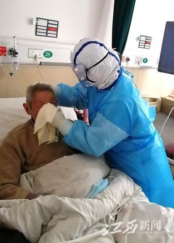 江西医疗队队员段晓萱在给患者洗脸。