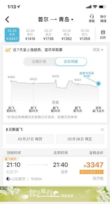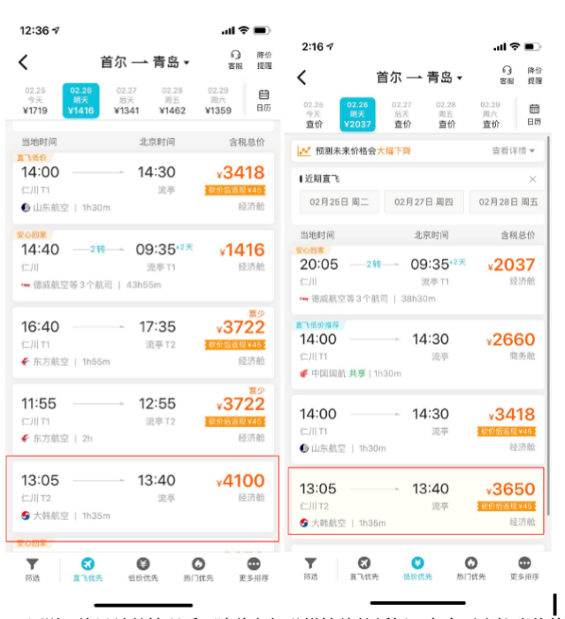(图说:首尔至青岛航线2月25日单程直飞航班,当日下午13:13分搜索,含税价格已逐渐平稳至3300元)