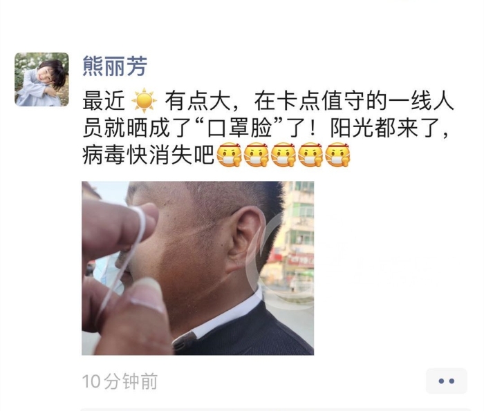 他叫熊炜,是南昌高新区管委会财政局的一名工作人员。日前,高新区从区直单位抽调党员干部组成抗疫突击队,以进一步充实麻丘镇疫情防控力量。熊炜主动“请战”,并被任命为突击队第四分队队长,带领队员们坚守麻丘镇的3个卡点,负责进出车辆和群众的登记、测温、劝导、生活用品采购等工作。他们每天早上9点就在户外工作,直到晚上6点才能回宾馆休息,长时间的户外工作,让熊炜晒成了“口罩脸”。