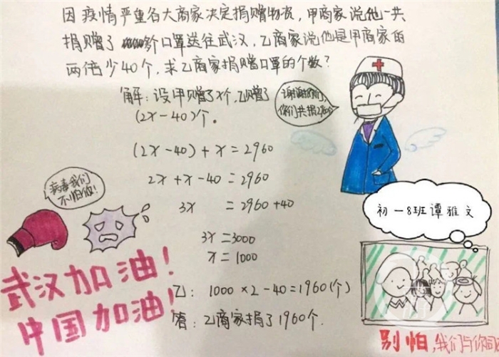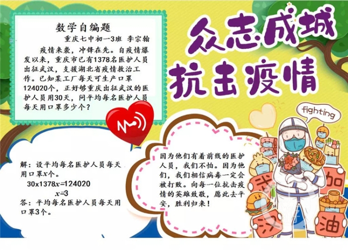 上周末,结合目前正在讲解的知识点“一元一次方程”,吴老师让同学们自己上网查看相关背景资料,以疫情为背景自主设计一道用一元一次方程解决的应用题,并编写小报。
