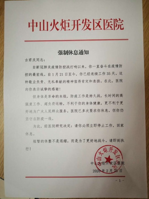 考虑到古君庆连续工作超过一个月,还患有肾结石,多次劝说休息无效,2月25日,火炬开发区医院开出了红头“休书”:“请你立即停止工作,回家休息。短暂的休整不是退缩,而是为了更好的战斗。”