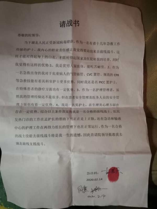 屡次请战支援一线 还请妻子签字“请战书”