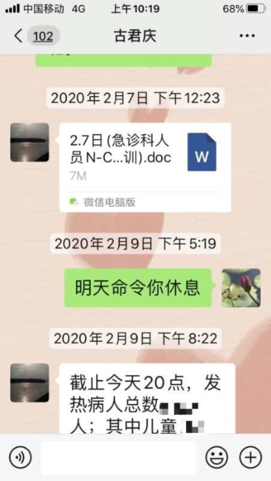 古君庆连续高强度工作,没有休息一天,同事们看在眼里,对他的身体感到担心,多次劝他休息,他仍然坚持每日到岗。2月9日,护理部主任刘赛平微信通知古君庆:“明天命你休息”。次日,古君庆又出现了发热门诊。
