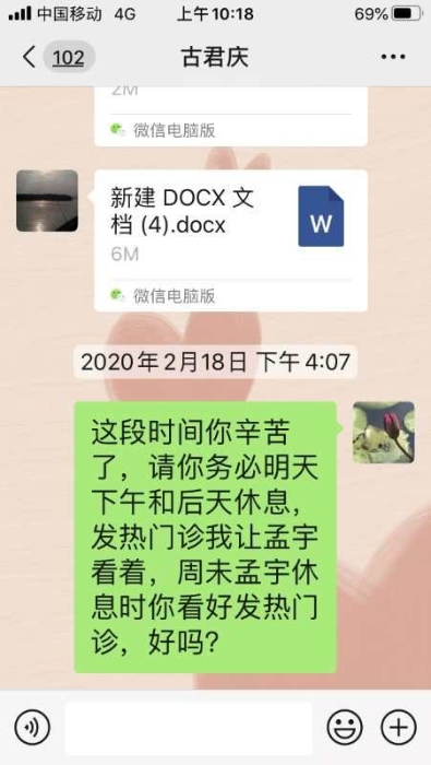 2月18日下午,护理部主任再次通知他: “这段时间你辛苦了,请你务必明天下午和后天休息。发热门诊我让孟宇看着……”然而,古君庆依旧没有理会,第二天一大早,同事们又在发热门诊看到他忙碌的身影。