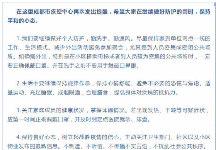 2月28日,记者从成都市卫健委获悉,针对担心境外疫情输入的情况,成都市疾控中心再次发出提醒,希望大家个人防护莫放松,在继续做好防护的同时,保持平和的心态。