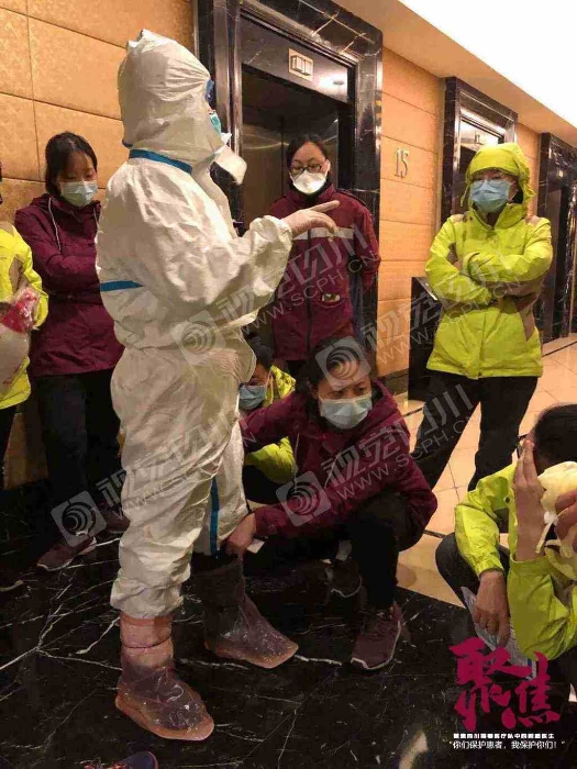 她们每天要穿着隔离服在病区呆几个小时,高强度、高风险的工作,加上只有三四个小时的睡眠,没有一个人抱怨,大家想的是怎么样在最短的时间内,去完善感控工作,保障医护人员顺利完成救援任务,平安凯旋。
