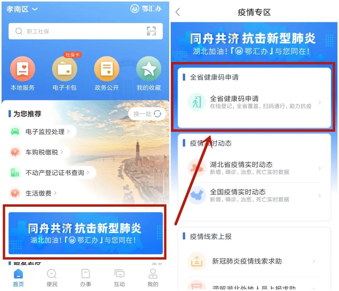 2.登录“鄂汇办”APP,进入首页“肺炎疫情专题板块”,选择“全省健康码申请”。