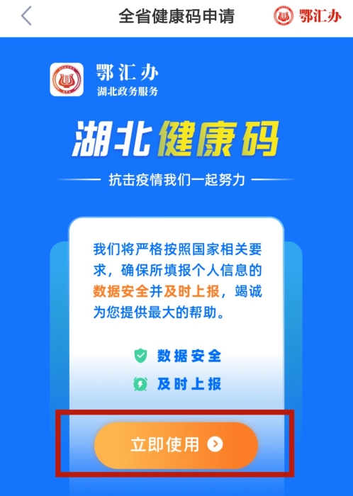 3.进入到“湖北健康码”首页,选择“立即使用”。