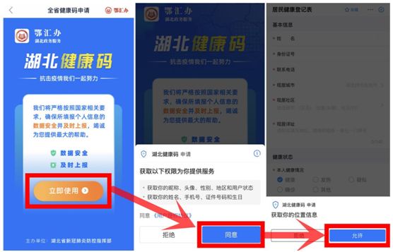 3.进入到“湖北健康码”首页,选择“立即使用”。并对弹出的“授权协议”选择“同意”,对弹出的“地址获取”选择“允许”。