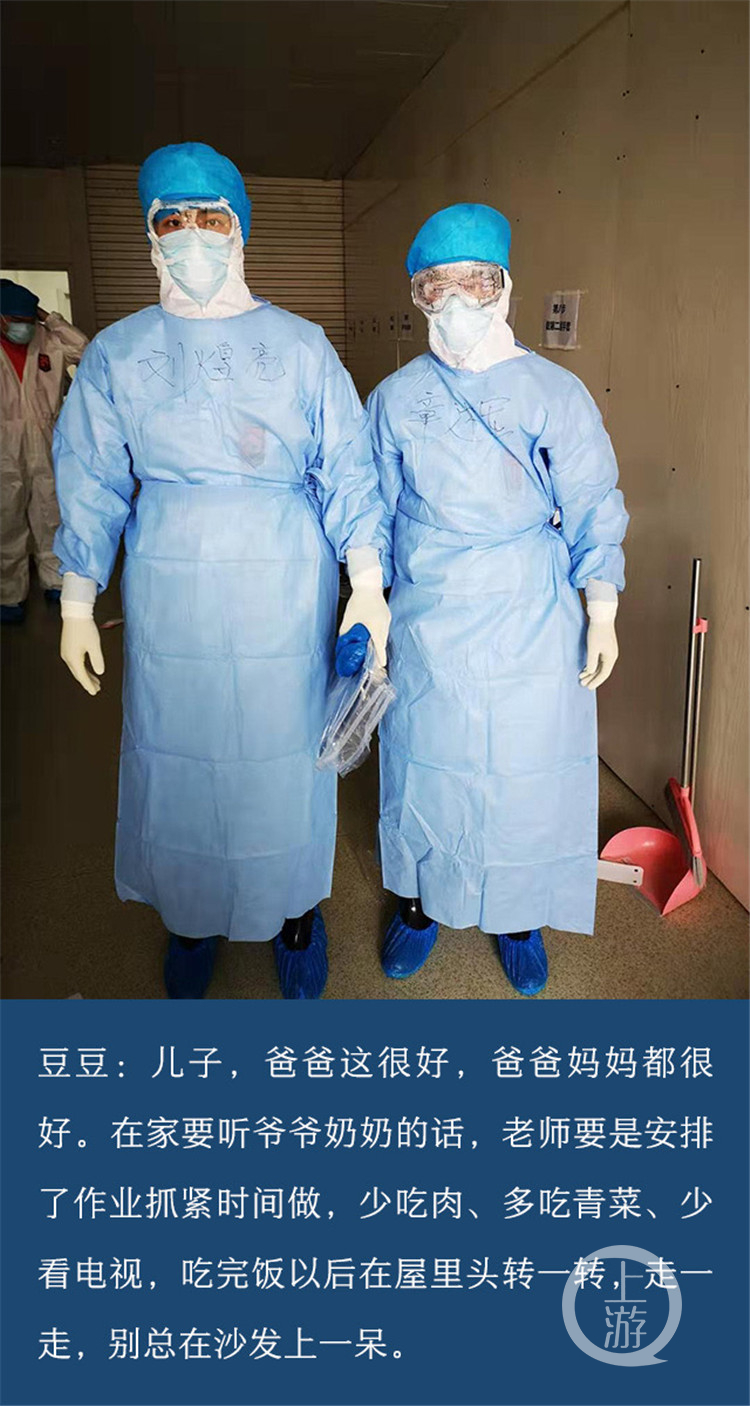 其实,刘煜亮大可不必把孩子交给老人,出征湖北。“出发之前,院领导、科室主任都找过我,说我爱人都去了,让我就不去了。我还是觉得应该来,作为一名呼吸科医生,在疫情面前是责无旁贷。这么大个事情,我是呼吸科医生,我不上谁上。”电话里,刘煜说得很干脆。