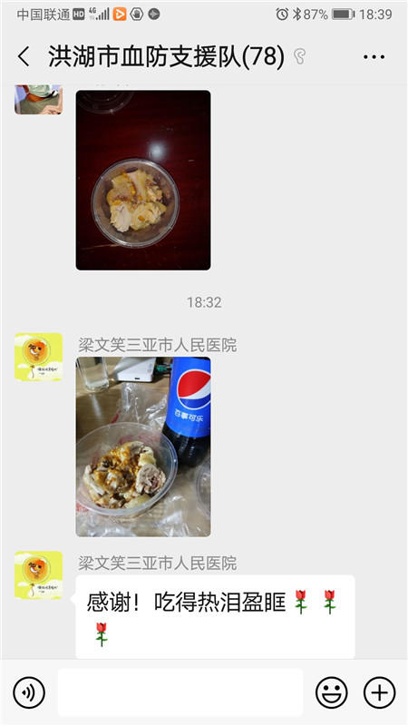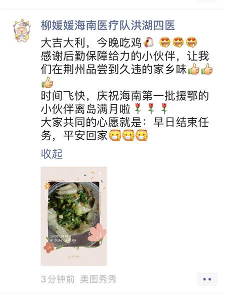 28日晚,海南支援荆州医疗队的微信群,开始热闹起来,支援洪湖四医的海南护士柳媛媛说:“大吉大利,今晚吃鸡,感谢后勤保障给力的小伙伴,让我们在荆州品尝到久违的家乡味,时间飞快,庆祝海南第一批援鄂的小伙伴离岛满月啦!大家共同的心愿就是:早日结束任务,平安回家。”