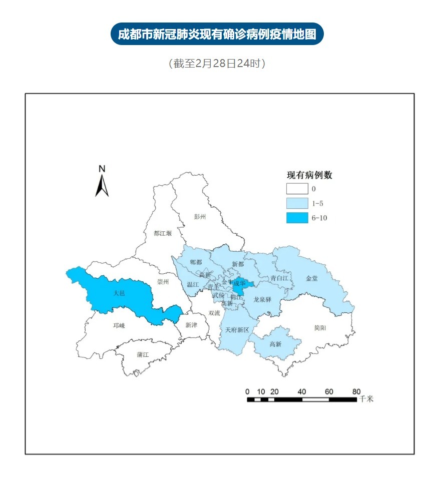 2月29日,记者从成都市卫健委获悉,成都市最新版新冠肺炎现有确诊病例疫情地图显示,截至2月28日24时,成都市已经有彭州市、都江堰市、崇州市、邛崃市、蒲江县、新津县、双流区、简阳市8地的现有病例为0。(其中,彭州市、都江堰市、崇州市、蒲江县4地从未报告确诊病例)