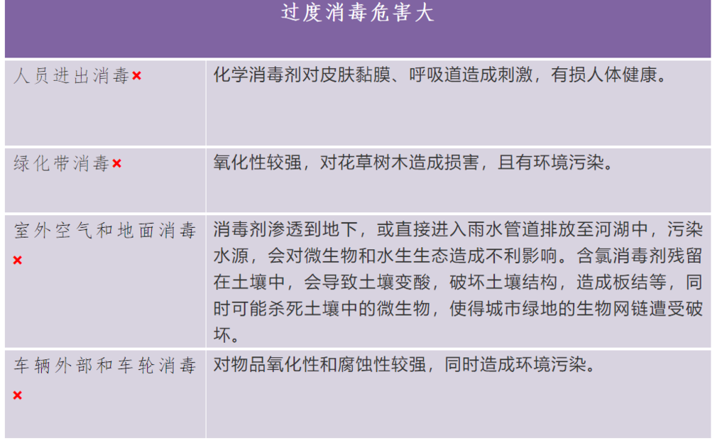 ✘不宜对室外环境开展大规模的消毒;