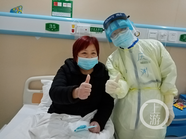 他们都很惊讶,也很惊喜,他们不停地表达着感激!35床的阿姨拉着我跟我合影,她说:“你们重庆的医护人员把我们护理得很好,都太辛苦了;你们要休息了啊,那等会儿我们大家病友,和你们医护人员一起合个影吧,我也把照片发回去给家里面人看,是你们把我们治好了,让他们知道你们,还是真心的给你说,谢谢了啊!”