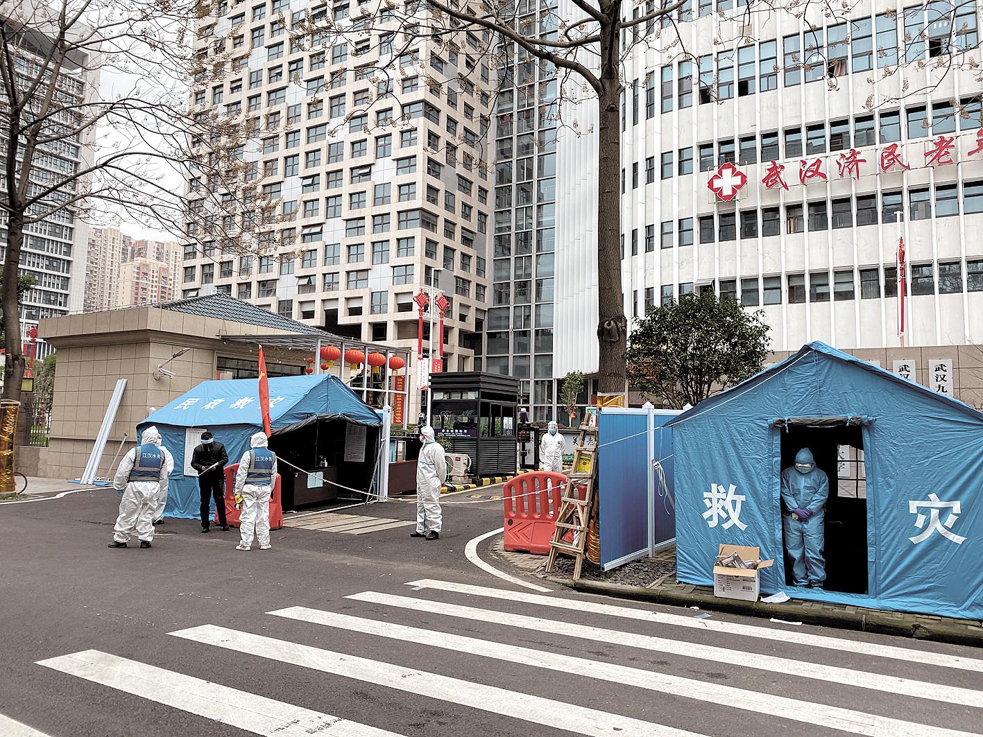 下午2时55分,在武汉市社会福利院门口两侧,记者看到有两顶蓝色民政救灾帐篷,保安、下沉社区党员等4人在门口值守。帐篷上挂有出入口管控责任人公示牌,包括院长、社区书记、网格员、民警、值守人员电话都在上面公示。下午3时1分,一老人家属拿着药品来到福利院门前,说明了老人所在楼层和床位号后,值守人员接过药品用消毒液消毒。该家属称,此次送的是母亲急需的治疗甲状腺的药物。“今年年前福利院就已通知,不能接老人回家,目前老人身体状态良好。”正说话间,一支由4人组成的疾控专家指导小组,来到福利院门前,在做了相关登记以及测温后进入福利院。