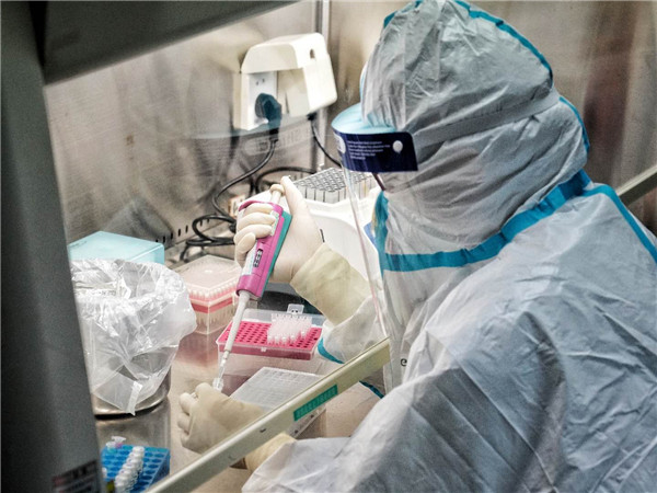 检测新型冠状病毒感染的肺炎疑似患者样本的风险极高,必须在符合条件的实验室中进行检验,核酸检测在这个实验室里的分子生物学实验室进行。进入分子实验室之前,技术人员必须采取生物安全三级个人防护。消毒、穿戴连体防护服、佩戴护目镜、N95口罩、双层乳胶手套等,全副武装,把自己裹得严严实实的。