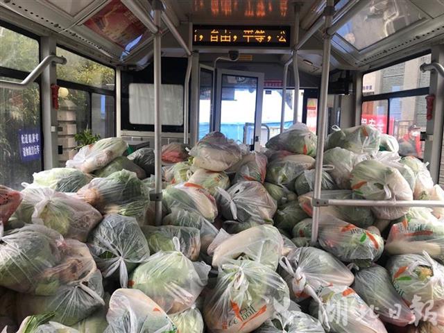 15分钟后,运菜公交车到达水生科技苑小区,随车的中商平价东湖店10名员工迅速下车卸货。穿着简易防护服、戴着手套的员工接力传递,不到5分钟就把91包“10元菜”整整齐齐地摆放在小区门口。