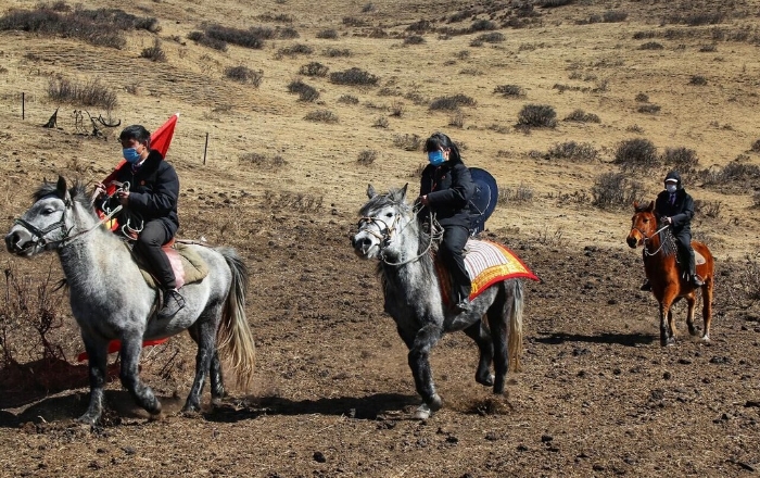 3月2日,省法院公布了一系列新闻图片,照片里三名法院干警戴着口罩,骑着马行走在草原上。原来, 这是近日阿坝州红原县流动双语干警们深入远牧点,为牧民群众宣讲抗疫知识的一幕。