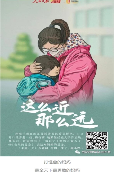 2月16日,交汇点新闻客户端上一篇《“妈妈去黄石了,600公里的思念” 一年级孩子的日记让人泪目》的稿件让很多网友动容。2月29日,人民日报全国党媒信息公共平台微信公号推出《这么近 那么远》系列插画,描绘最美逆行者背后的感人故事,其中就提到了交汇点的这篇稿件,并配文“打怪兽的妈妈,是全天下最勇敢的妈妈”。