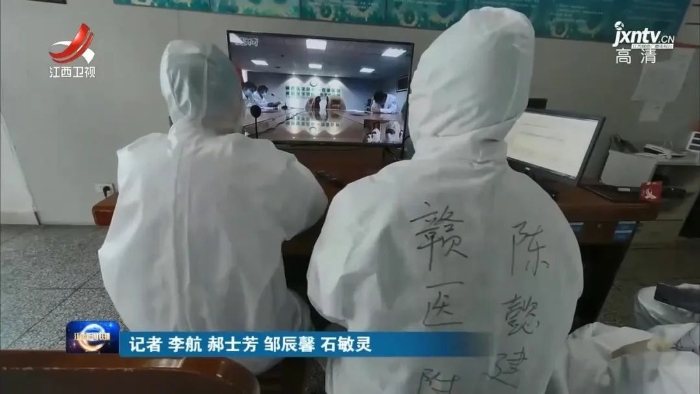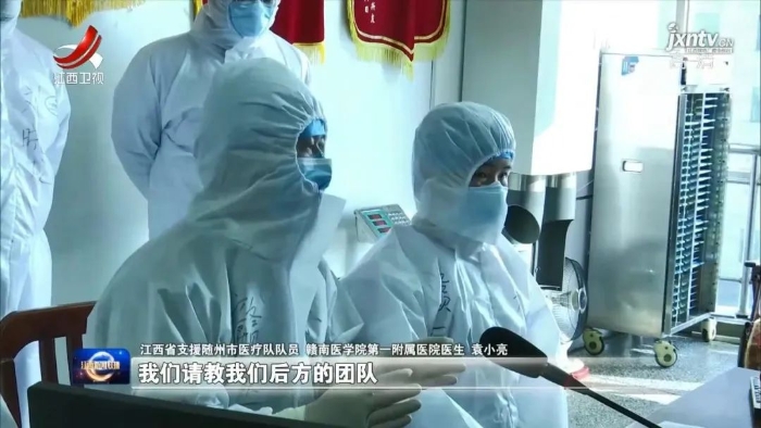 记者 李航:我现在是在广水市第一人民医院的感染三病区,现在在我身旁,感染三病区的援随医务人员,就正在和赣南医学院第一附属医院的六位专家共同会诊两位重症患者。
