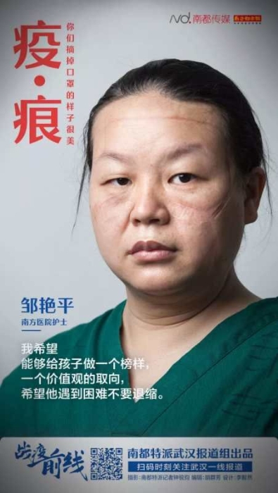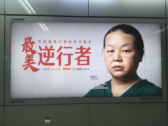 据了解,在全国上下抗击新冠疫情的战场上,涌现出许多让人难忘的瞬间。此前,人民日报官微转发了一组“最美的逆行者”的海报,里面就有邹艳平摘下口罩后有着“压痕”的相片。这组相片被制作成电子宣传屏,在多地机场、地铁、大型商圈标性的标志性建筑上展示,许多城市为战疫一线的工作者亮灯致敬。