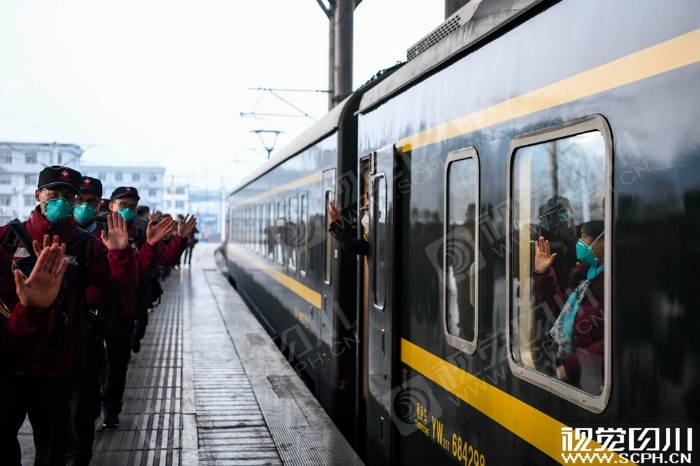 2月5日早晨6时许,四川国家紧急医学救援队抵达武昌站,车上的乘客向他们挥手致敬。