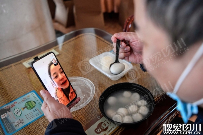 2月8日,是中国传统节日元宵节,四川国家紧急医学救援队队员吃着元宵与家人视频。