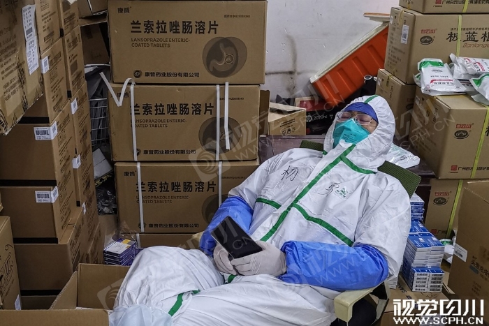 2月16日,四川国家紧急医学救援队的队员杨勇在药房长时间工作后,躺在椅子上小憩。