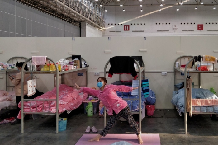 2月21日,武汉汉阳方舱医院内,一位患者练习瑜伽。