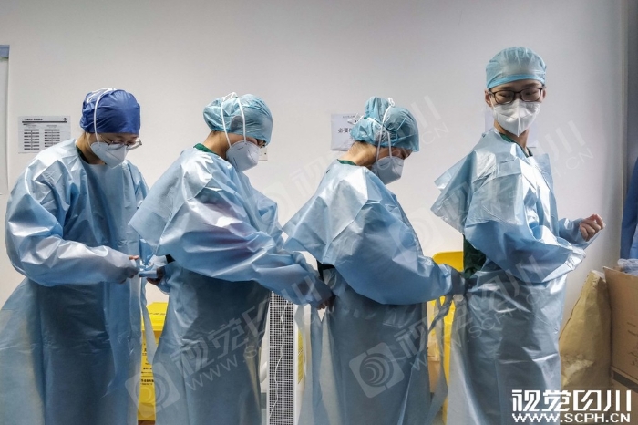 2月27日,四川省第三批援助湖北医疗队的队员进入武汉大学人民医院东院隔离病房前,4位90后护士们互相帮助穿隔离衣。