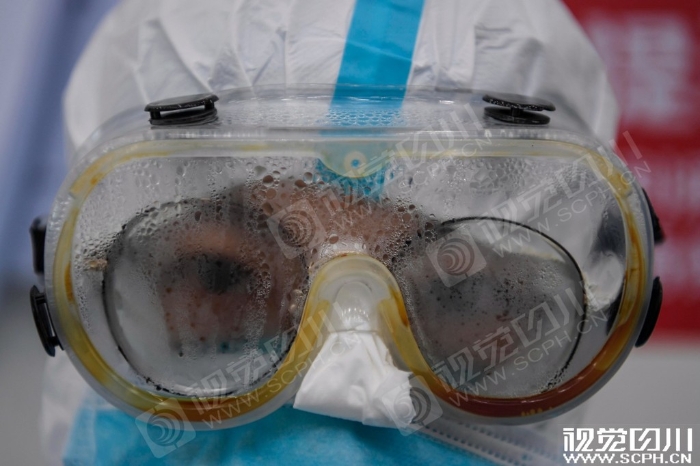 3月4日,汉阳方舱医院内,四川第六批援助湖北医疗队队员余雅梅的眼镜与护目镜被雾气打湿。