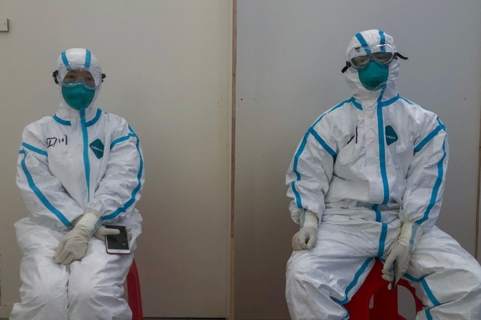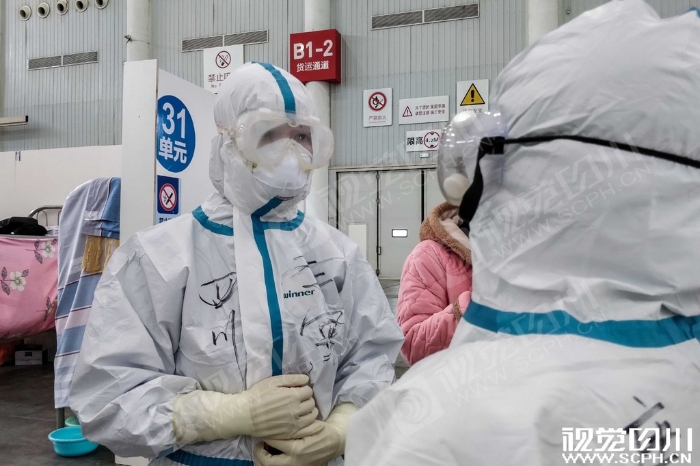 2月26日,四川国家紧急医学救援队的队员准备进入汉阳方舱医院。
