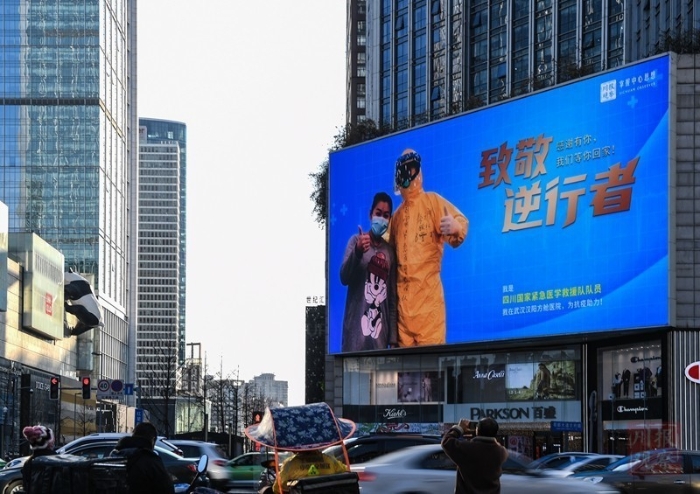 由中共四川省委宣传部策划指导、川报观察和视觉四川特别制作推出的“致敬逆行者 点亮四川”大型公益宣传活动于2月27日启动。饱含家乡父老深情的致敬海报、打call视频,每晚都准时出现在四川21个市(州)城市户外大屏幕上,各地用城市大屏集体统一播放的方式致敬奋斗在抗疫一线的四川英雄们。