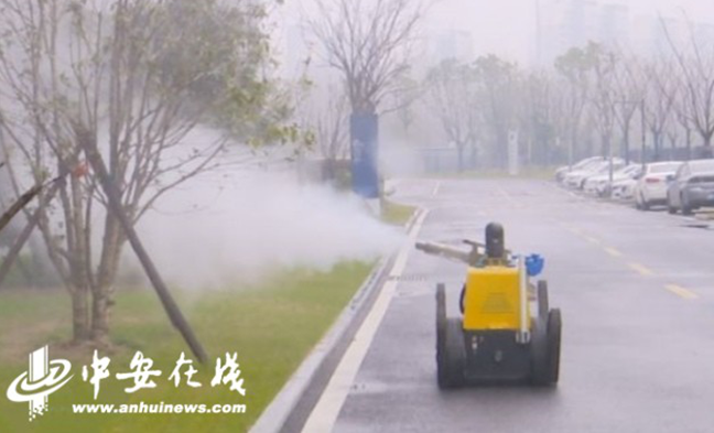 2月24日上午,合肥经开区智能装备科技园内,一台外形酷似微型坦克的机器人,正在喷洒消毒水。