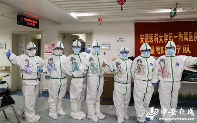 这些卡通画的作者、安医大一附院援湖北医疗队员常浩告诉记者,平日里爱美的女性,穿上防护服就变成了女战士。三八节到了,就想给她们单调的防护服上留下一抹色彩,增添一份乐趣,为她们加油打气,缓解她们持续紧绷的精神状态。《天仙配》是安徽黄梅戏最著名的剧目之一,祝女队员们像七仙女一样美丽动人。给医疗队的队长、安医大一附院高新院区副院长张泓画的是“花木兰”,象征着援鄂抗疫就像木兰领军,必定凯旋。
