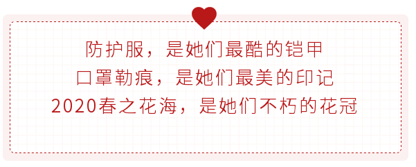 但是,面对这场没有硝烟的战争,她们义无反顾地千里驰援,出征前线。从武汉到黄石,从方舱医院到中心医院,她们奋勇参战,以职业的名义救死扶伤,在抗击疫情的战场上建功立业。厚重的防护服,是她们最酷的铠甲;口罩勒下的印痕,是她们最美的印记。她们无惧风险,努力救治病人,细心护理病患,展现了新时代女性的坚定从容和智慧刚毅,她们就是守护在病人身边的女英雄。