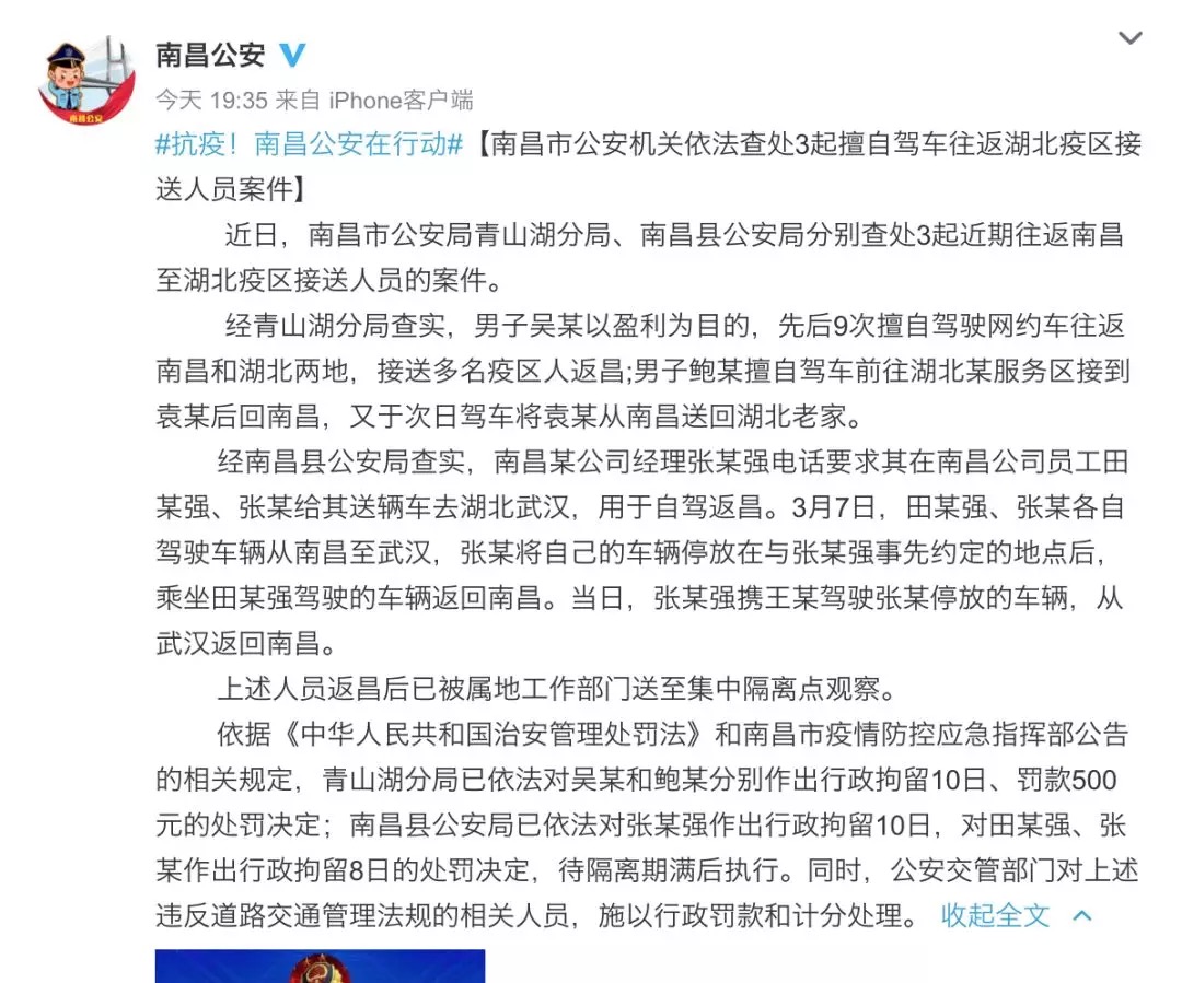近日,江西南昌市公安局青山湖分局、南昌县公安局分别查处3起近期往返南昌至湖北疫区接送人员的案件。