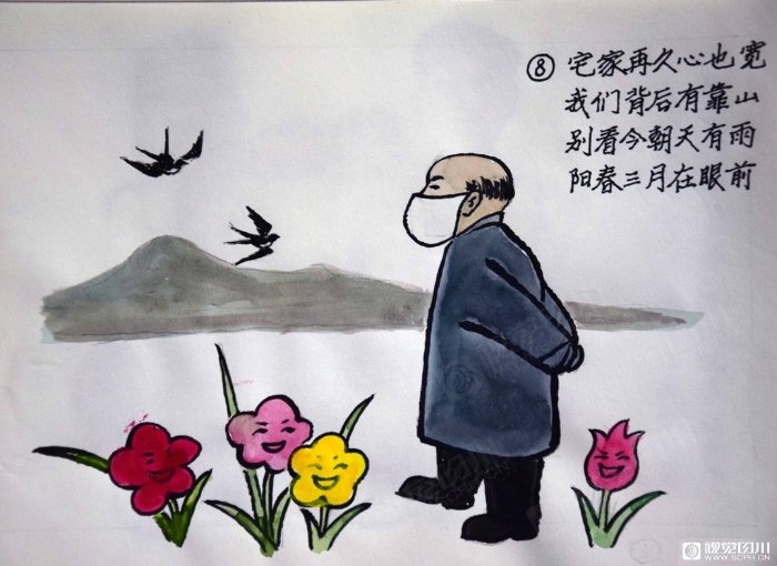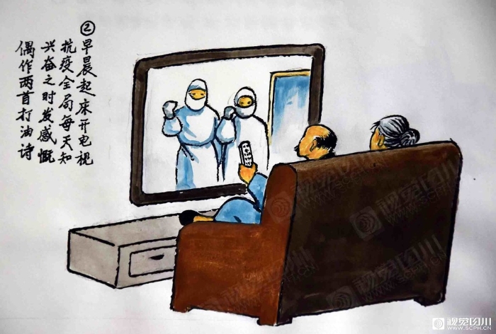 第一天写诗,第二天起稿,第三天绘画。从3月初到目前,欧阳戈已经创作了10幅《成都老头抗疫宅家记》系列漫画,他表示,疫情不止,创作也不停,要用漫画的方式鼓舞市民的抗疫士气。